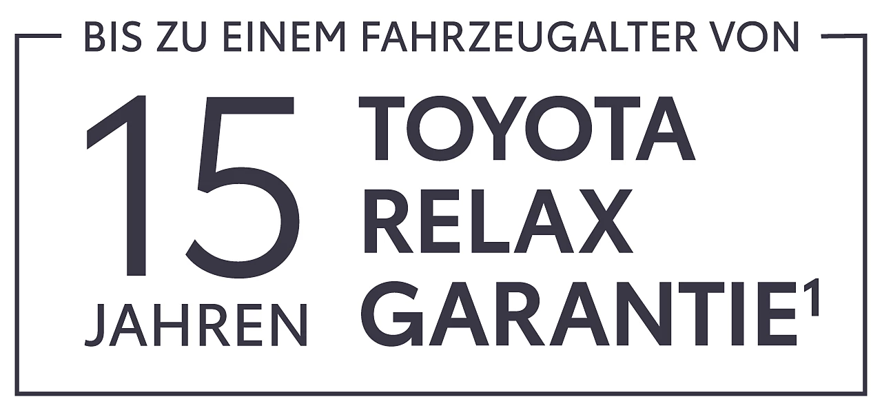 1 Es gelten die Toyota Relax Garantiebedingungen der Toyota Motor Europe S.A./N.V., Avenue du Bourget 60, B-1140 Brüssel, Belgien. Die Toyota Relax Garantie gilt ausschließlich für Toyota Fahrzeuge nach jeder Inspektion bei einem Toyota Partner bis zu einem Fahrzeugalter von 15 Jahren oder einer Laufleistung von 250.000 km. Die Toyota Relax Garantielaufzeit beträgt 12 oder 24 Monate in Abhängigkeit des für das Fahrzeug vorgesehenen Inspektionsintervalls. Details, Umfang und Einschränkungen (z.B. Zeitwertbegrenzung) von Toyota Relax entnehmen Sie bitte den Garantiebedingungen unter: http://www.toyota.de/relax.